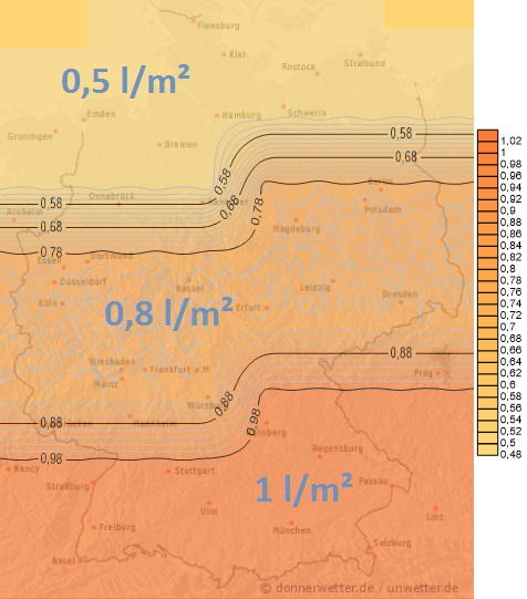 Am Dienstag ziehen neue teils kräftige gewittrige Regengüsse über große Gebiete Deutschland hinweg. Dabei können Niederschlagsmengen von über 10 Liter pro Quadratmeter fallen, stellenweise auch über 20 Liter pro Quadratmeter.