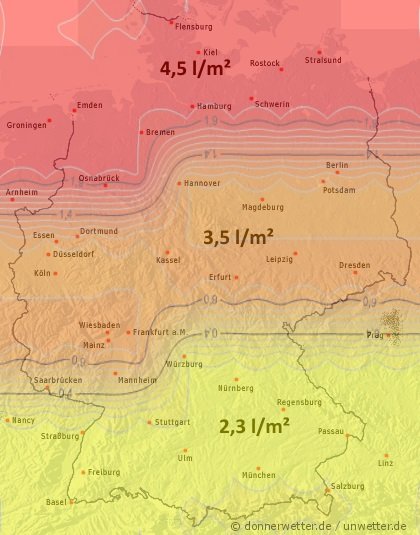 Von Norden her setzt sich trockene Luft in Deutschladn durch. Größere Regenmengen gab es nur in den Mittelgebirgen bis zu den Alpen. Teilweise wurden bis zu 50 l/m2 wieder in einzelnen Gewittern beobachtet, besonders rund um den Schwarzwald und der Alb.