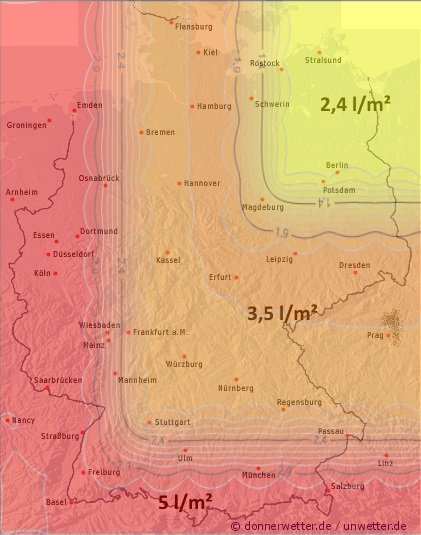 Es gab nur wenig Regen in den letzten 24 Stunden. Nur vereinzelt gab es ein paar Tropfen. DIe Verdunstung betrug zwischen 3 und 5 l/m2, so dass es zum Teil für wenige Stunden mal abtrocknete. Allerdings nähern sich schon wieder Schauer und Gewitter, so dass es wieder nass wird.