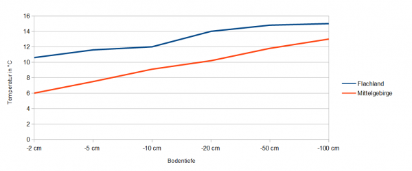 In nachstehender Grafik sehen sie die aktuellen durchschnittlichen Bodentemperaturen (2 bis 100 cm Tiefe) im Flachland sowie in den Mittelgebirgen.