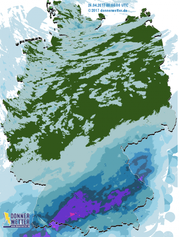 Tagsüber fällt in Süddeutschland weiterer Niederschlag, in höheren Lagen als Schnee, in tiefen Lagen meist als Regen. Die Niederschlagsmengen liegen dabei in der Regel zwischen 5 und 20 Liter / m². In höheren Lagen sind demnach bis zu 20 cm Neuschnee möglich. Im übrigen Land bilden sich nur örtlich leichte Schauer.