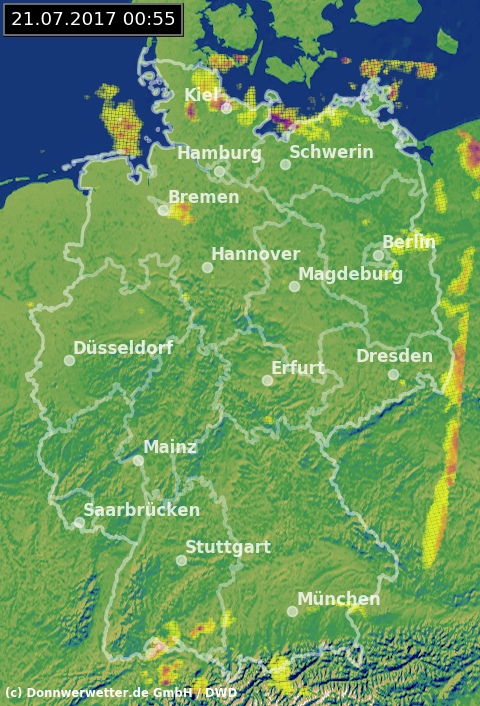Das Radarbild spiegelt das wieder, was sich gestern gezeigt hat. Viel Regen und vereinzelte Gewitter zogen gestern über das Land. Gerade im Südosten im Bayerischen Wald und in Oberfranken, zeigt das Radarbild starke Niederschläge.