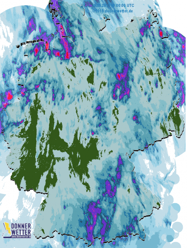 Die meisten Gewitter mit Starkregen wurden in Bayern, den neuen Ländern und in Niedersachsen und Schleswig-Holstein registriert. Im Westen waren die Schauer schwächer und zum Tiel war es in Hessen und Baden-Württemberg vollständig trocken. Dies ändert sich aber heute, wie das Radar zeigt.