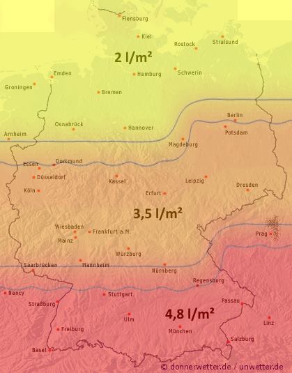 Betroffen war dieses Mal vor allem die Mitte und die Nordhälfte Deutschlands, wobei die höchsten Niederschlagsmengen tendenziell an den Küsten und der Grenze zu Polen verzeichnet wurden. Mehr als 15 Liter Niederschlag pro Quadratmeter bildete jedoch auch hier die absolute Ausnahme.
