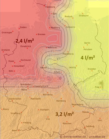 Richtig nass wurde es jedoch nur im äußersten Süden. Von der französischen bis zur tschechischen Grenze regnete es teils kräftig. Zwischen Bodensee und Bayrischem Wald fielen dabei lokal mehr als 50 Liter Niederschlag pro Quadratmeter.