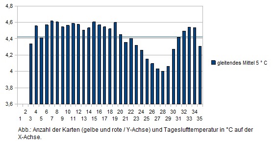 Unterhalb von 20  °C im gleitenden Temperaturmittelbereich liegt die Anzahl der Karten deutlich niedriger und erreicht bei einer Höchsttemperatur von 28 °C ein Minimum von 4 Karten pro Spiel. Oberhalb von 29 °C nimmt die Anzahl der Karten pro Spiel wieder deutlich zu und erreicht bei Temperaturen von mehr als 30 °C das Ausgangsniveau von unter 20 °C.