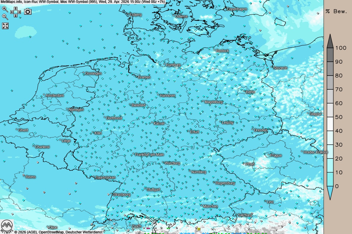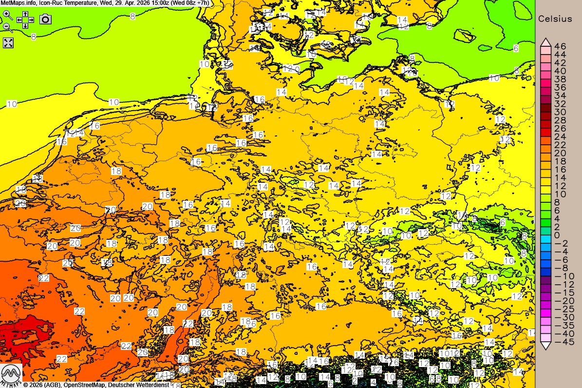 Die Wetter- und Temperaturkarte für 15:00 Uhr nach ICON-RUC:
