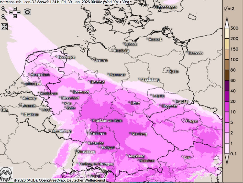 Die Wetterkarte und Temperaturabweichung für Donnerstagmorgen (06:00 Uhr) sowie die 24-Stunden-Schneemengen nach ICON:
