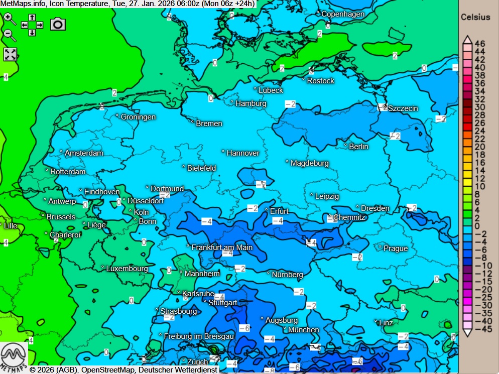 Die Wetter- und Temperaturkarte für Dienstagfrüh (06:00 Uhr) sowie die 24-Stunden-Schneemengen nach ICON: