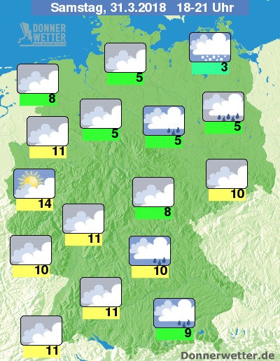 Heute Abend fällt über dem Nordosten, Osten und dem Alpenvorland zeitweise Regen, hier und da auch Schneeregen oder Schnee, sonst ist es zwar stark bewölkt, aber trocken. Die Temperatur liegt bei 5 bis 14 Grad.
