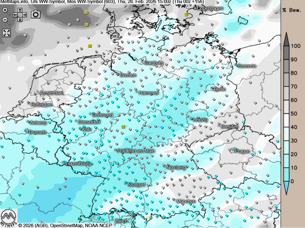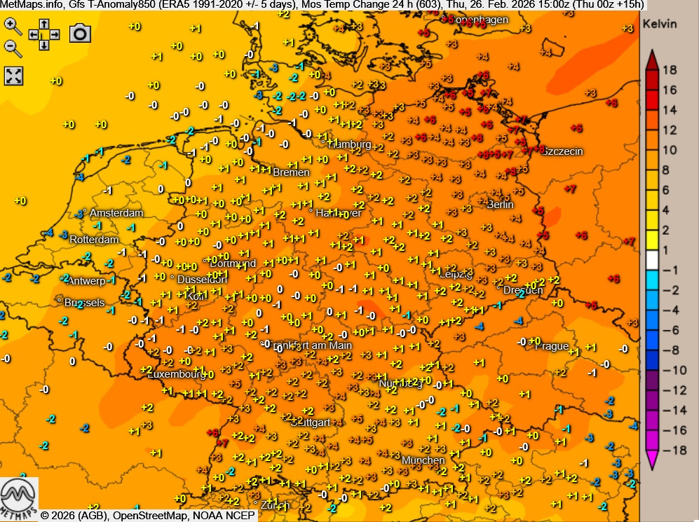 Die Wetter- und Temperaturkarte sowie die Temperaturabweichung mit der 24-Stunden-Temperarturveränderung (15:00 Uhr) nach GFS: