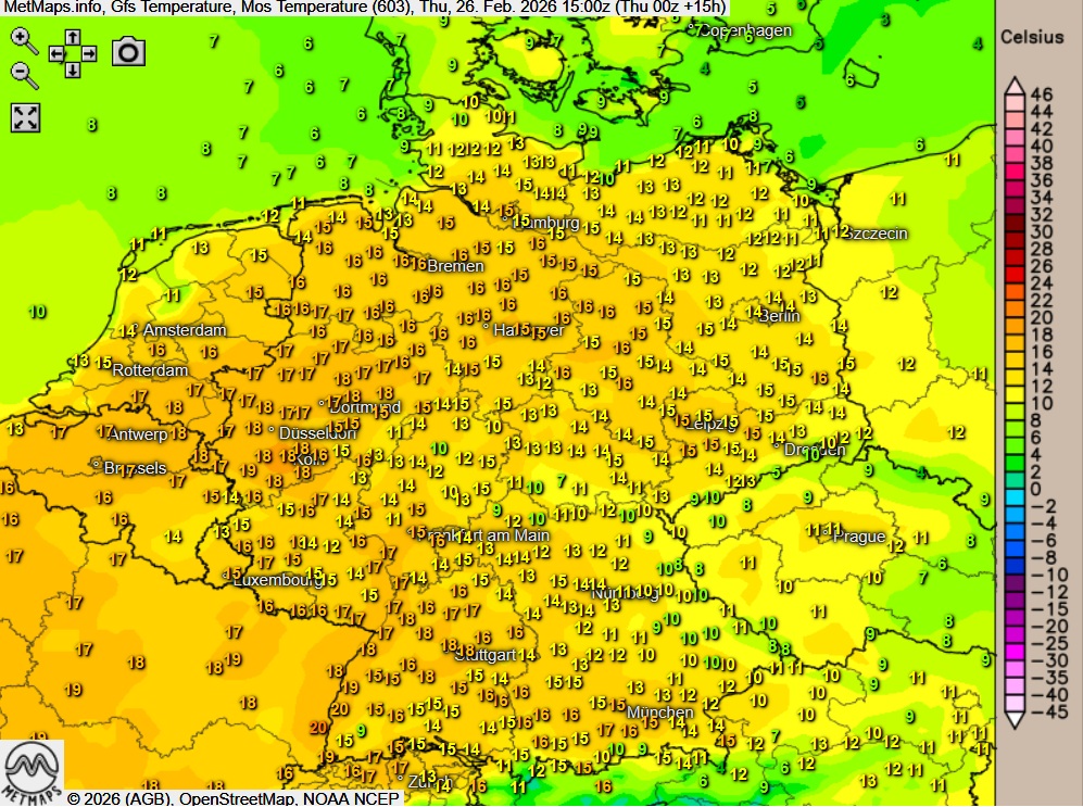 Sehr warmer Februarnachmittag mit Spitzenwerten um 23 Grad.