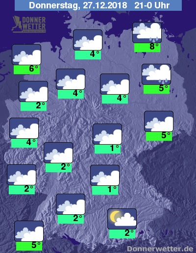 Bis Mitternacht breiten sich auch Wolkenfeldern bis weiter in den Süden aus. Außerdem können sich Nebelgebiete wieder verdichten. Im Nordosten kann es stellenweise etwas tröpfeln.