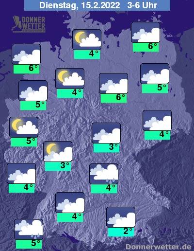 In der kommenden Nacht halten sich zum Großteil dichte Wolken, kurze Auflockerungen sind möglich. Im Süden fällt gebietsweise Regen, sonst bleibt es aber weitgehend trocken. Die Temperatur sinkt auf 6 Grad in Magdeburg und bis 2 Grad in Augsburg. An der Nordsee weht ein teils stürmischer Wind.