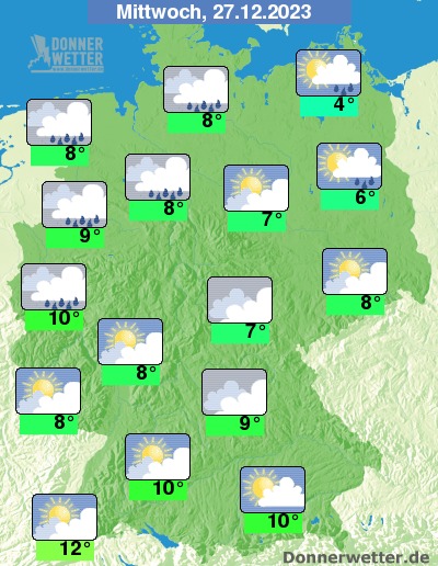 Am Mittwoch zeigt sich der Süden zum Teil heiter. Im übrigen Land ist es hingegen meist stark bewölkt oder trüb, im Norden und zum Teil im Westen fällt gebietsweise Regen, während es sonst weitgehend trocken bleibt. Die Temperatur erreicht nur 4 Grad in Vorpommern und bis 12 Grad im Breisgau. An der Ostsee weht ein zunehmend starker, an der Nordsee stürmischer Wind mit Sturmböen.