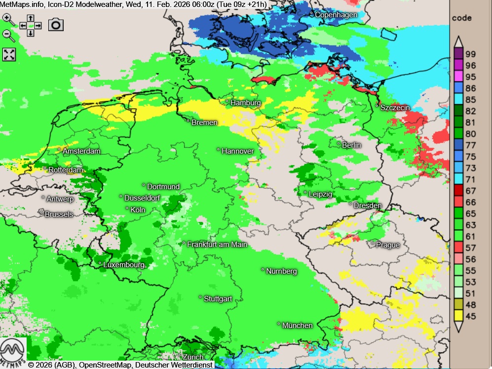 Die Wetter- und Temperaturkarte für Mittwochmorgen (06:00 Uhr) sowie die 24-Stunden-Regenmengen für Mittwoch nach ICON: