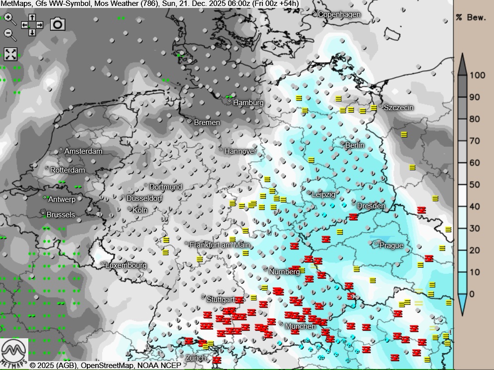 Die Temperaturen erreichen im Dauernebel im Südosten Werte um 2 Grad, sonst werden Höchstwerte um 5 Grad im Nordosten und 12 Grad am Niederrhein erreicht.