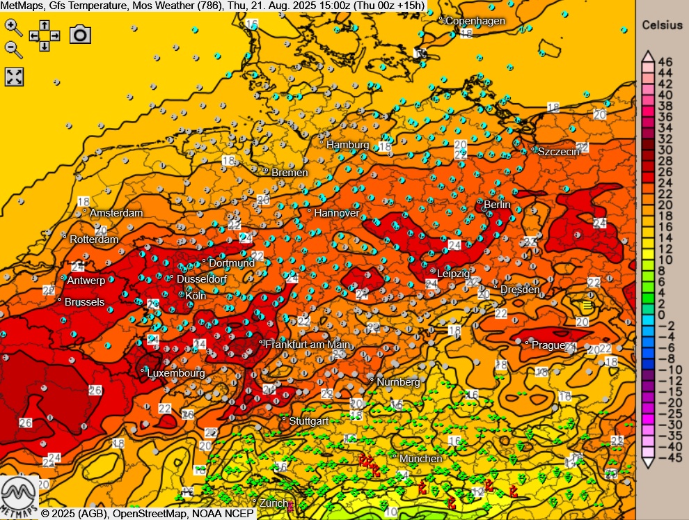 Die Temperatur- und Wetterkarte für Donnerstagnachmittag (15:00 Uhr) sowie die 12-Stunden-Regenmengen für Bayern bis 23:00 Uhr nach GFS.