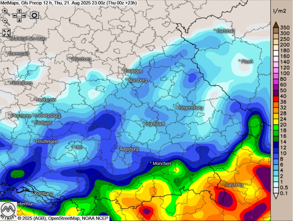 Am Donnerstagnachmittag zeigt sich der Himmel über dem Süden und Südosten wechselnd oder stark bewölkt, dabei fällt teils schauerartiger und gewittriger Niederschlag. Vor allem in Alpennähe sind lokal auch unwetterartige Verläufe mit Starkregen wahrscheinlich.
