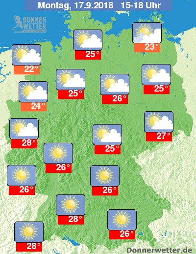 Die Temperaturen erreichen im Nachmittagsverlauf Werte um 22 bis 23 Grad C an Nord- und Ostsee und um 28 Grad C in der Kölner Bucht.