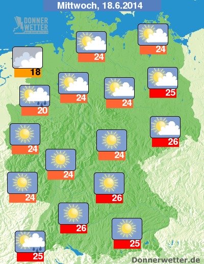 Der heutige Mittwoch verspricht ein schöner Sommertag zu werden. Besonders die Südhälfte kann sich über verbreitet mehr als 12 Sonnenstunden freuen. Im Nordseeumfeld können sich zum Teil hartneckige Wolken halten, aber auch hier bleibt es mehrheitlich trocken bei etwa 18 Grad. Sonst werden bis zu 26 Grad erreicht.