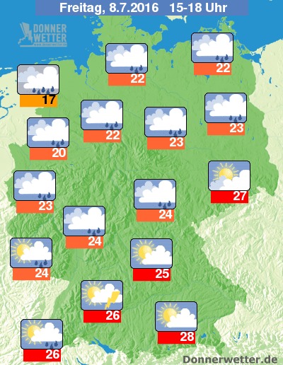 Die Temperaturen erreichen Werte um 16 Grad C in Ostfriesland und um 28 Grad C im Alpenvorland.