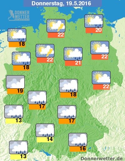 Heute bleibt es im Süden und Südwesten Deutschlands bedeckt und es fällt häufig Regen. Im übrigen Bundesgebiet ist es wechselnd bis stark bewölkt, dabei bilden sich zeitweise Schauer, zudem sind auch einzelne Gewitter möglich. Die Temperatur steigt auf 13 Grad am Bodensee und bis 22 Grad in Berlin.