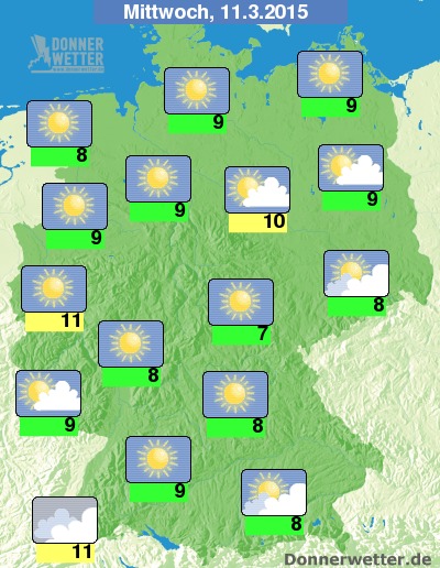 Heute ziehen vor allem im äußeren Süden und Osten zeitweise dichte Wolken durch, die hier und da auch Regen bringen können, sonst zeigt sich der Himmel hingegen verbreitet nur leicht bewölkt oder sogar wolkenlos und es bleibt trocken. Im Südwesten des Landes bleibt es jedoch oft stark bewölkt, Regen fällt jedoch auch hier kaum. Die Temperatur steigt auf 7 Grad im Vogtland und bis 11 Grad im Breisgau und in der Kölner Bucht.