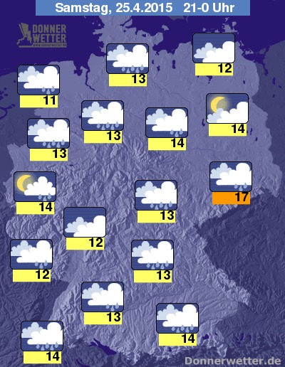 In der Nacht zum Sonntag fällt in der Osthälfte der Bundesrepublik noch zeitweise, gebietsweise auch kräftiger Regen, nach Westen hin lockert die Bewölkung hingegen oft auf und es bleibt weitgehend trocken, bevor gegen Morgen im Nordwesten Deutschlands erneut Regen aufzieht. Die Temperatur sinkt auf 14 Grad in Dresden und etwa 7 Grad am Odenwald.