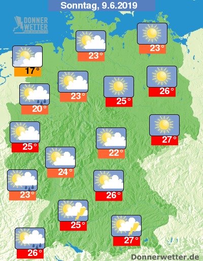 Am Sonntag ist es oft heiter bis sonnig, von Westen her nimmt die Bewölkung jedoch im Tagesverlauf immer weiter zu und gegen Abend bilden sich über der Westhälfte des Landes gebietsweise Schauer und Gewitter. Im übrigen Bundesgebiet bleibt es dagegen trocken und meist auch noch locker bewölkt. Die Temperatur steigt auf teils nur 17 Grad an der Nordseeküste und bis 27 Grad in Oberbayern.