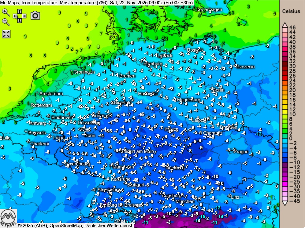 Die Temperatur- und Wetterkarte für Samstagfrüh (06:00 Uhr) nach Icon: