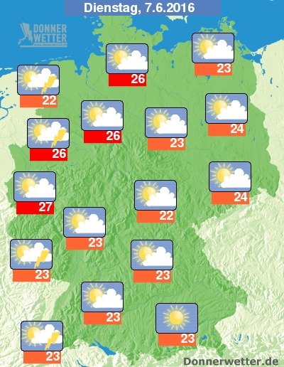 Heute ist es zunächst verbreitet heiter oder auch sonnig und noch überall trocken. In den westlichsten Landesteilen ziehen im Tagesverlauf jedoch zunehmend auch dichte Quellwolken auf, dabei sind hier einzelne Schauer und auch örtliche Gewitter möglich. Im übrigen Bundesgebiet ziehen auch hier und da mehr Wolken auf, das Gewitterrisiko bleibt jedoch vergleichsweise gering. Die Temperatur steigt auf 22 Grad im Grabfeld und bis auf teils schwülwarme 27 Grad in Köln.