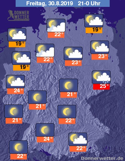 In den Abendstunden zeigt sich der Himmel an den Küsten sowie im Nordosten des Landes wechselnd bewölkt, in den übrigen Landesteilen dominieren heitere Phasen oder nur lockere Wolkenfelder. Im Westen und Südwesten scheint die Sonne auch verbreitet von einem wolkenlosen Himmel. Über Bayern, dem Schwarzwald sowie dem Erzgebirge sind weiterhin noch Schauer und Gewitter möglich, die teils auch kräftiger ausfallen können, sonst bleibt es meist trocken.