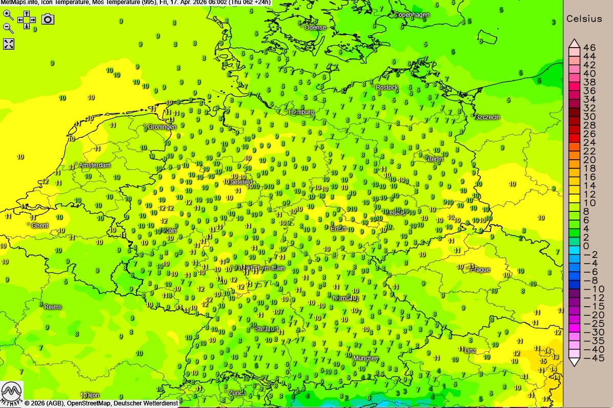 Die Temperatur- und Wetterkarte für 06:00 / 12:00 Uhr sowie die Temperaturabweichung Europa um 15:00 Uhr nach ICON: