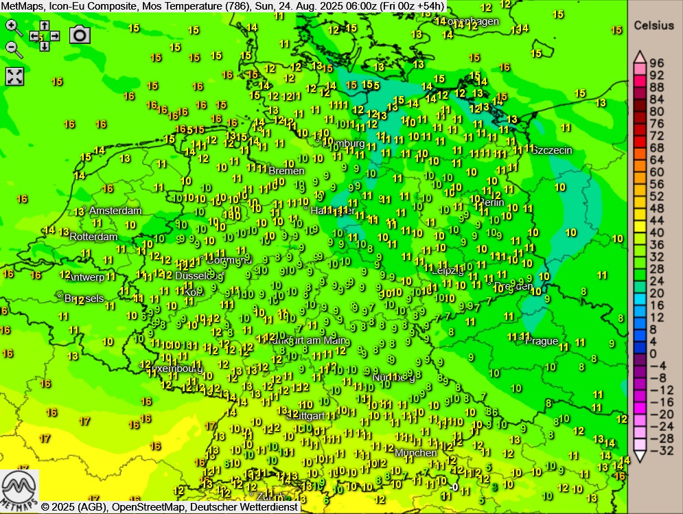 Die Karte zeigt die Frühtemperaturen am Sonntag (06:00 Uhr) nach ICON-Eu: