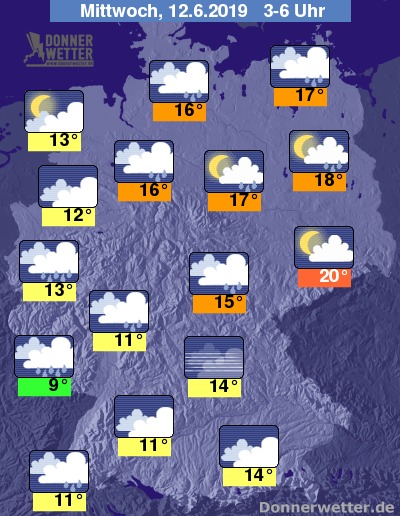 Auch während der zweiten Nachthälfte fällt gebietsweise Regen oder es gehen Schauer und einzelne Gewitter nieder. Stellenweise klart der Himmel auch auf. Örtlich können sich Nebelfelder bilden.