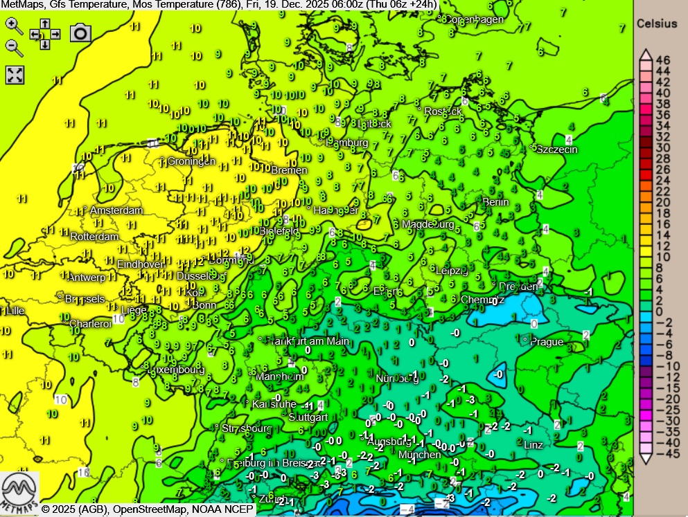Die Temperaturen erreichen Höchstwerte um 3 Grad im östlichen Bayern und 13 Grad am Niederrhein.