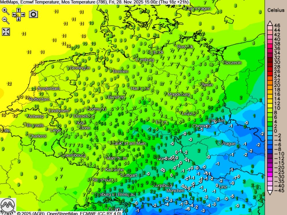 Im Dauernebel teils nur Werte um den Gefrierpunkt, im Nordwesten am mildesten.