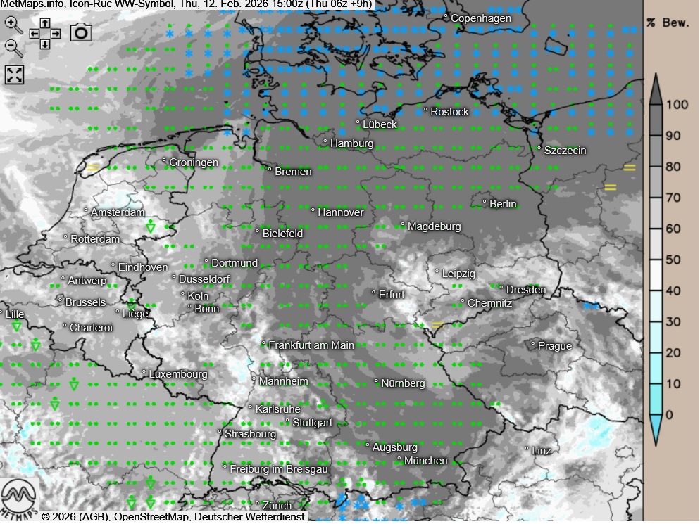 Am Donnerstagnachmittag bleibt der Himmel über den meisten Landesteilen stark bewölkt oder es ist bedeckt, dabei fällt vor allem in den Staulagen der Mittelgebirge teils ergiebiger Regen, im äußersten Norden und Nordosten auch Schnee. Es ist windig bis stürmisch, in den Höhenlagen auch Sturm oder schwerer Sturm.