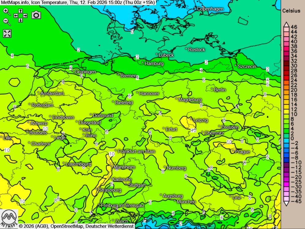 Die Temperaturen erreichen am Nachmittag Höchstwerte um 1 Grad im Nordosten und um 10 Grad am Kaiserstuhl.