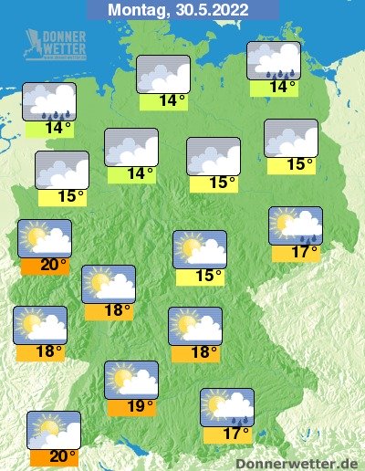 Am Montag ist es im Süden verbreitet heiter, teils ziehen hier einige Wolken durch, die aber nur selten Schauer bringen. Im übrigen Land ist es aufgelockert bis stark bewölkt, dabei können sich gebietsweise Schauer bilden. Die Temperatur erreicht 14 Grad im Norddeutschen Tiefland und bis 20 Grad an Mittel- und Oberrhein.