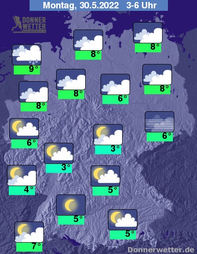 In der Nacht zum Montag bleibt der Himmel über dem Norden verbreitet dicht bewölkt, dazu bleibt es bis auf wenige Ausnahmen trocken. Im Süden ist es sternenklar oder locker bewölkt und trocken. Im übrigen Land zeigt sich der Himmel locker bis aufgelockert bewölkt und es bleibt weitgehend trocken. Die Tiefstwerte liegen bei 9 Grad an der Nordsee und 3 Grad im Grabfeld.