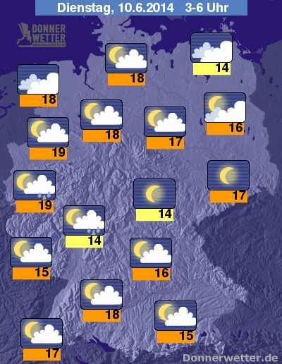 Die Nacht zum Dienstag verläuft für die meisten ruhig, im Norden lassen die Gewitter auch langsam nach. Von der Mitte bis in den Süden klart der Himmel sogar häufig auf. Die Temperaturen gehen nur auf 19 Grad im Ruhrgebiet und bis etwa 14 Grad an der Ostsee zurück.