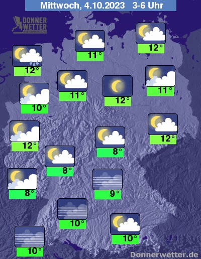 In der bevorstehenden Nacht klingen die Schauer auch im Süden und Osten meist rasch ab und der Himmel lockert auf, häufig ist es auch sternenklar. Im Umfeld der See ziehen dagegen auch oft dichte Wolken durch, hier können sich weiterhin einzelne Schauer bilden. Die Temperatur sinkt auf 12 Grad in Köln und bis 8 Grad in Jena.