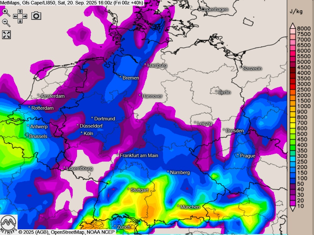 Die Strömungs- und Temperaturkarte für Samstagfrüh (06:00 Uhr) nach ICON-EU sowie die Cape/Lifted-Karte nach GFS für den Samstagnachmittag (16:00 Uhr):