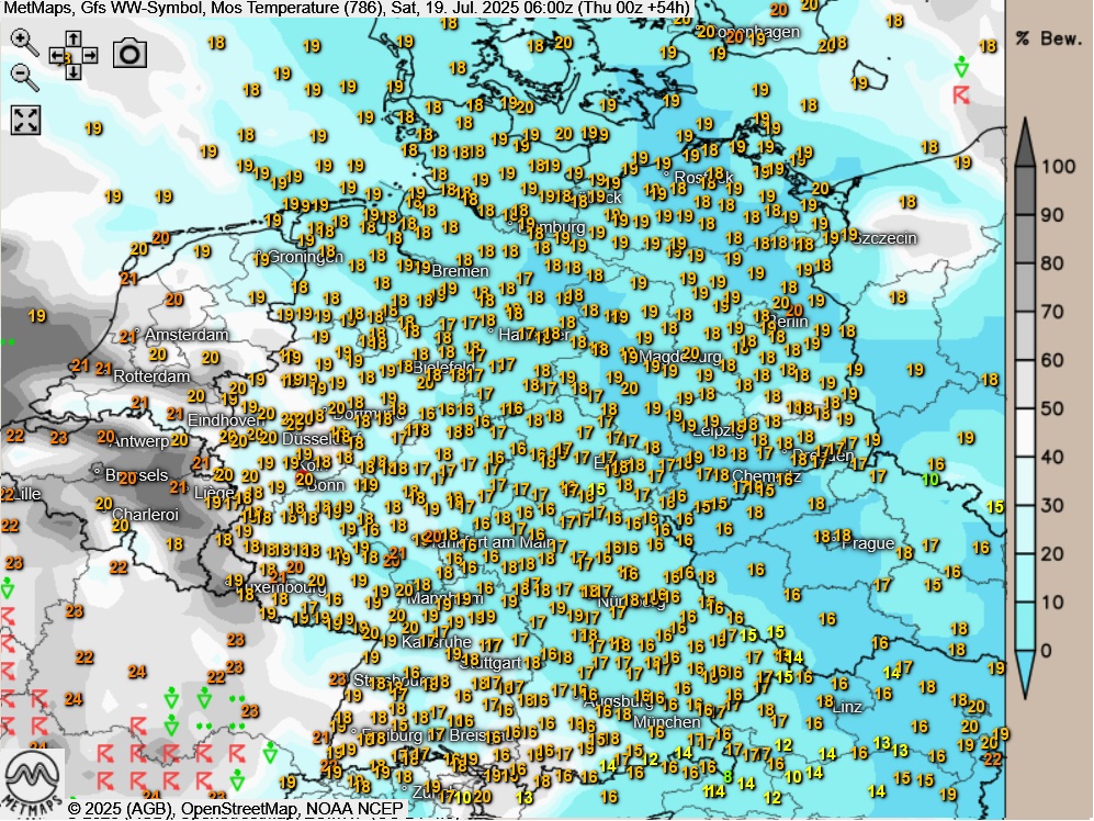 Die Wetter- und Temperaturkarte für Samstagfrüh, 06.00 Uhr nach GFS.
