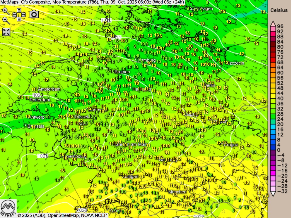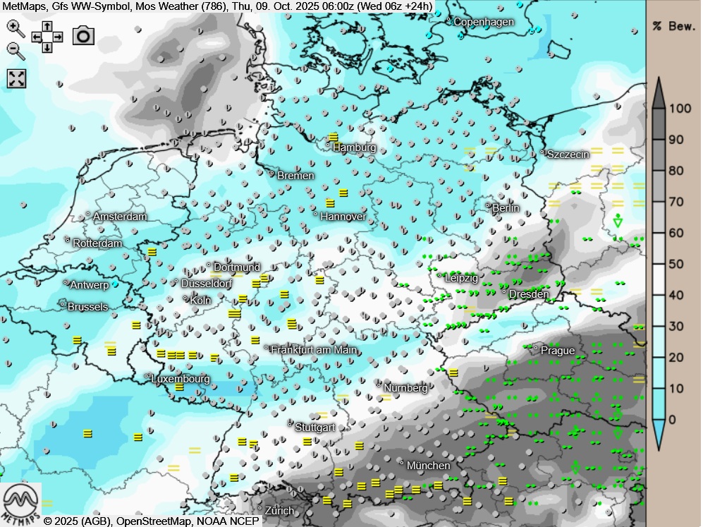 Am Donnerstag zeigt sich der Himmel anfangs verbreitet bedeckt oder es ist nebelig-trüb, Auflockerungen sind im Tagesverlauf vor allem in der Mitte und im Süden möglich. Im Südosten fällt am Donnerstag zeit- und gebietsweise etwas Regen oder Sprühregen, sonst bleibt es meist trocken.