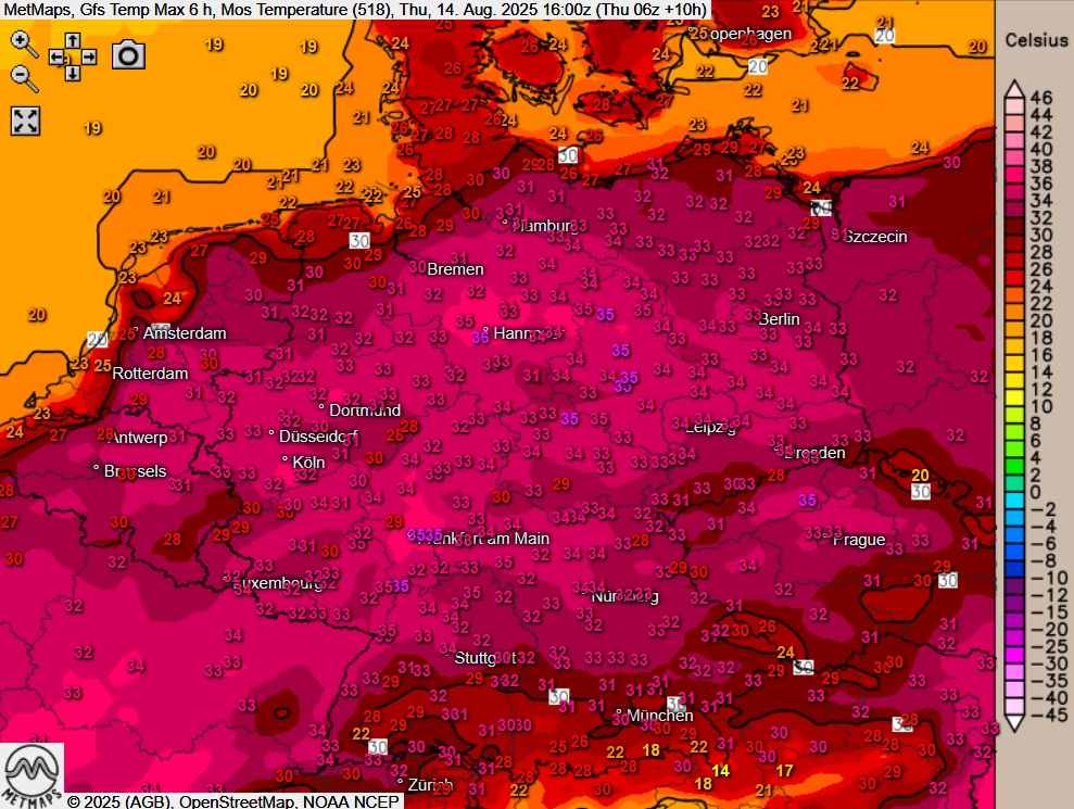 Die Temperaturkarte für den Donnerstagnachmittag mit den Sechs-Stunden-Maximalwerten nach GFS: