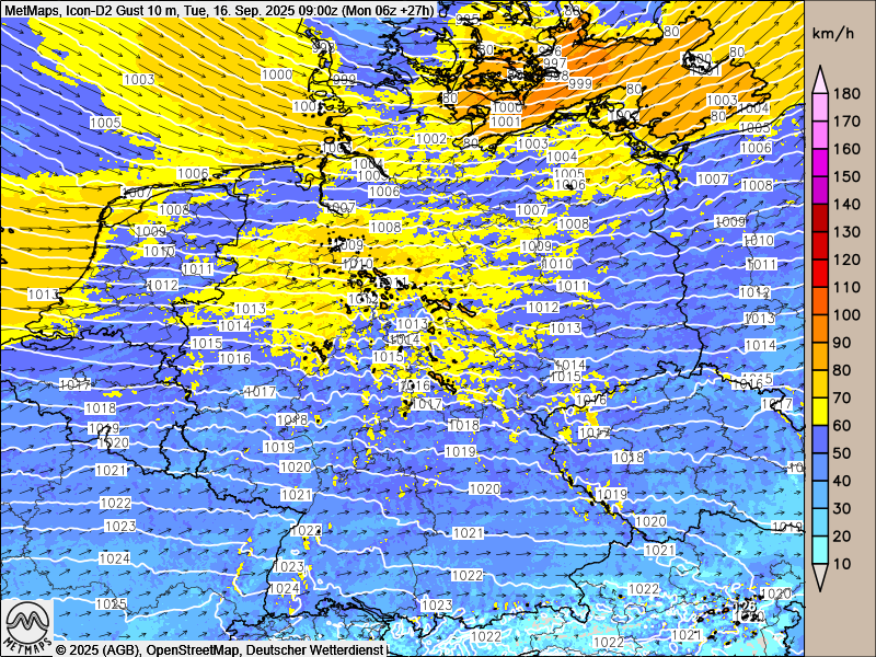 Die Böenkarte für Dienstagfrüh nach ICON-D2 (09:00 Uhr) sowie die 24-Stunden-Regenmengen für Dienstag nach GFS.