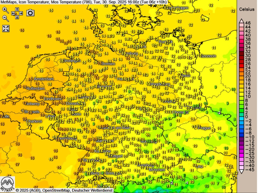 Die Lufttemperaturen für Dienstagnachmittag (16.00 Uhr) sowie die Sechs-Stunden-Regenmengen bis 22:00 Uhr nach Icon: